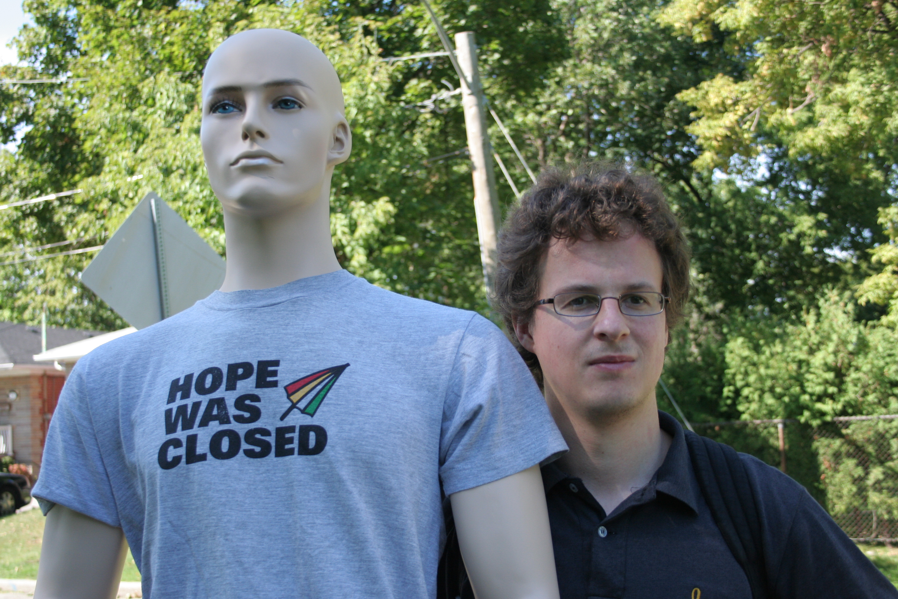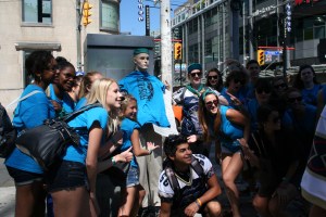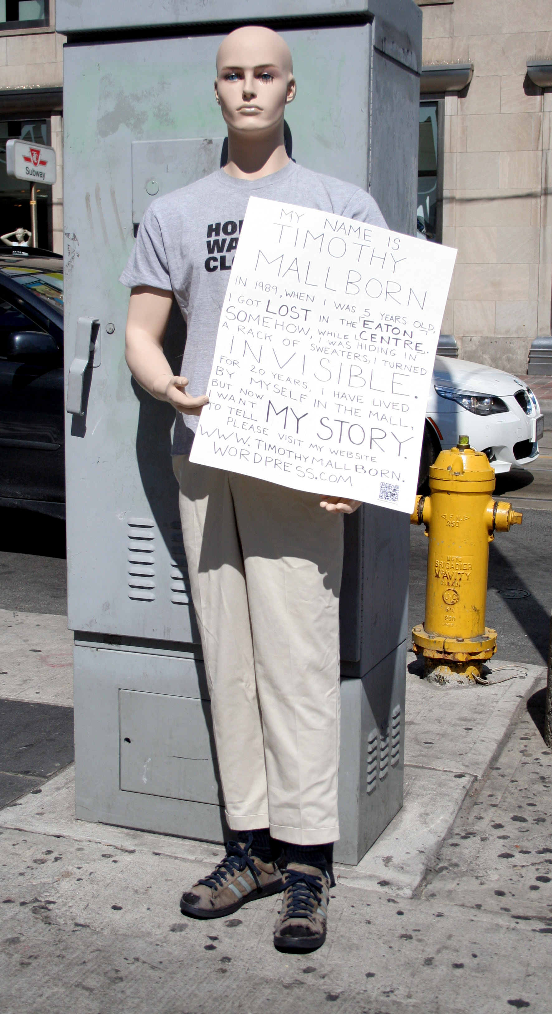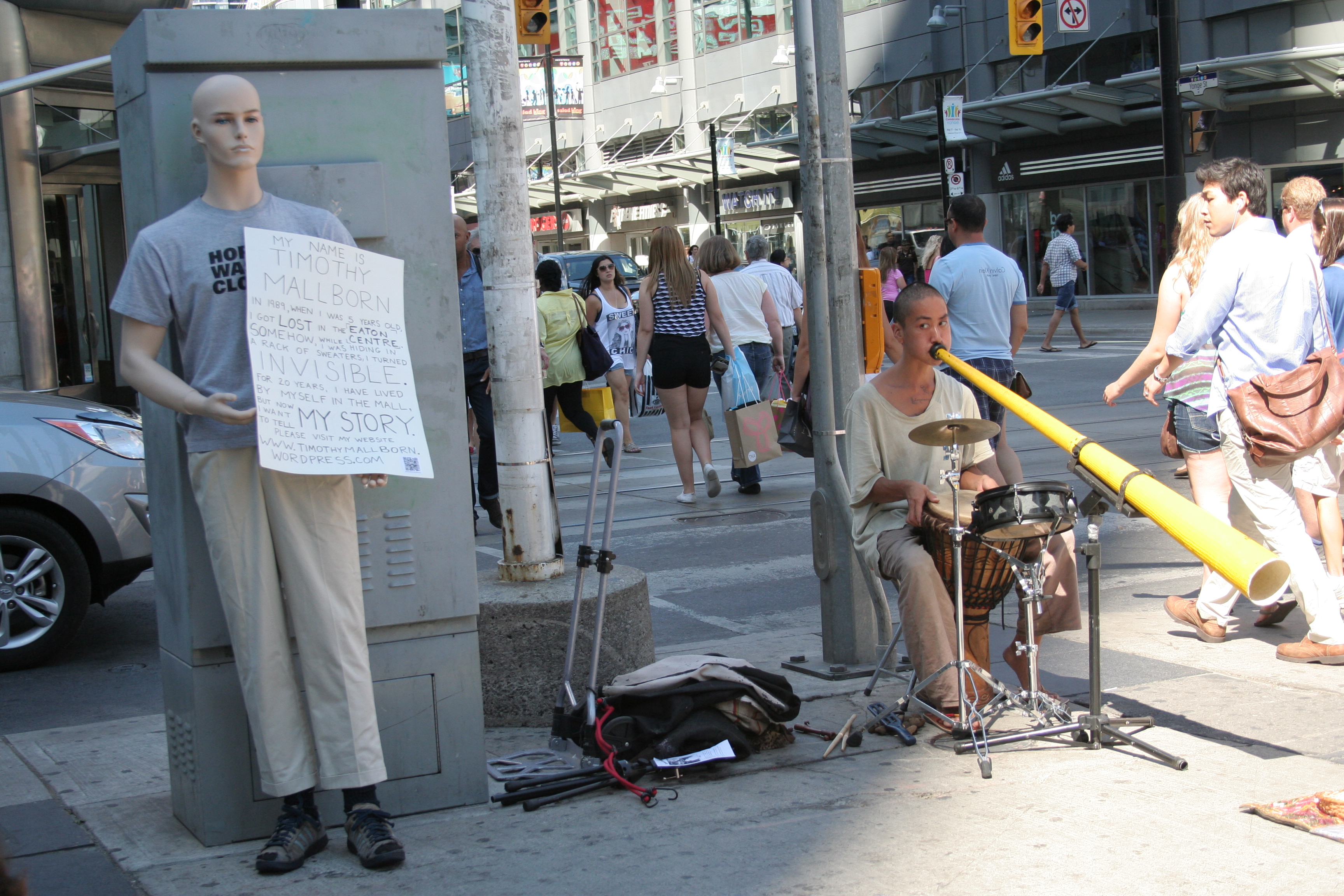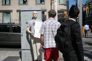 My trusty assistant and I set the mannequin up at Dundas Square, but security banished us to the South-West corner of Yonge and Dundas where the crazy conglomerate. If you’re not from Toronto, this is our famous soapbox corner, and it is overflowing with buskers, preachers and those with something unfathomable to proclaim.