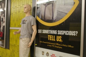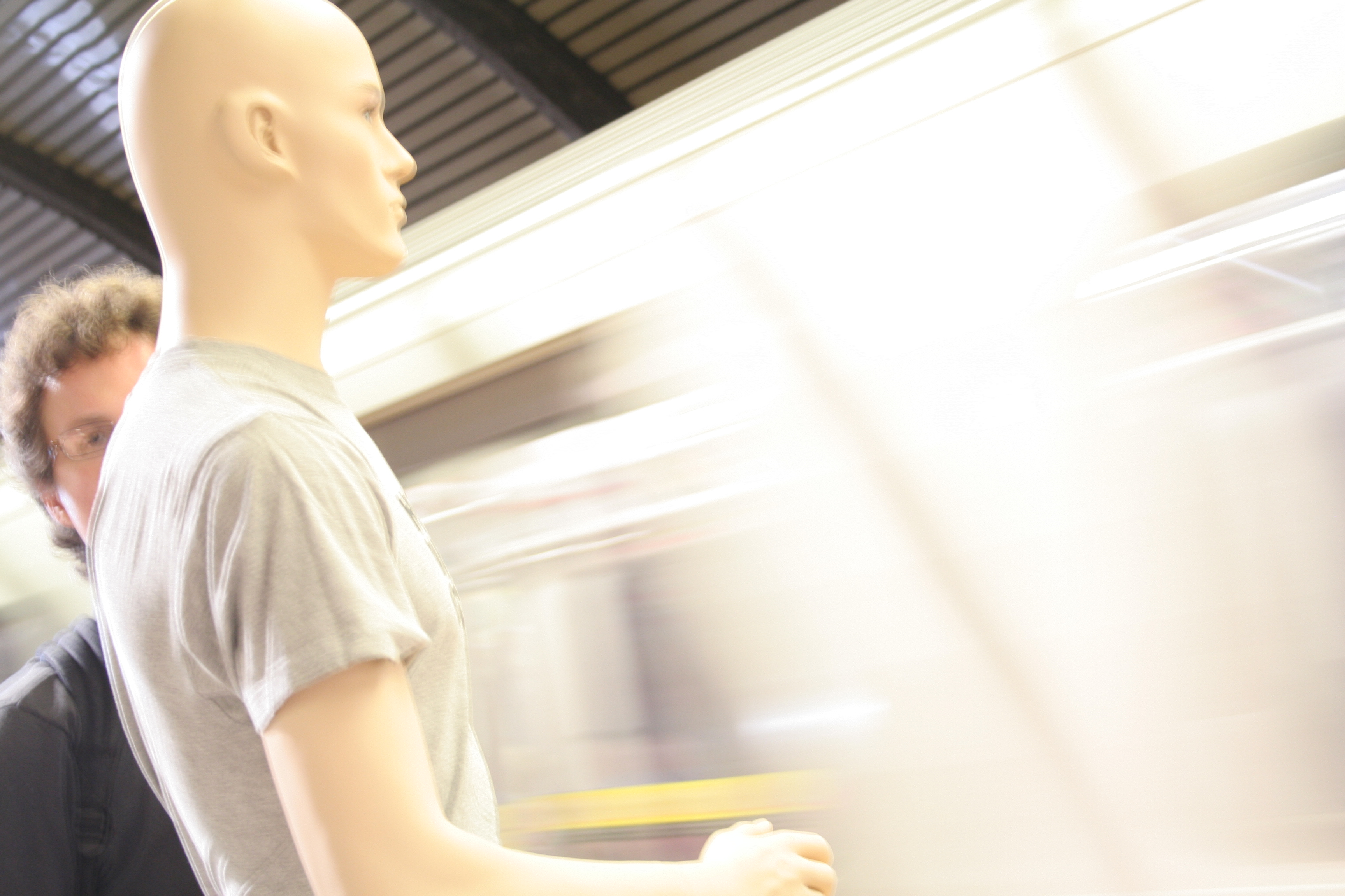 The mannequin made his way downtown on the subway. Nothing suspicious here; please move along.